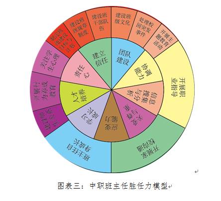 中职班主任的工作领域,由培养学生成长、建设班集体、引导职业生涯、家长沟通以及自身成长五个部分组成。经过开发中职班主任关键任务手册和核心素养手册,我们研究总结出完整的班主任的胜任力模型应分为内外两层,具体见图表三。