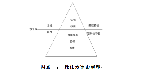 Spencer借鉴Freud人格理论中的冰山理论,结合对胜任力的深入研究,用海中的冰山类比胜任力的结构。从冰山模型的构造来看,它主要包括知识、技能、自我概念、特质和动机等五种类型的层次性要素。其中,知识与技能处在冰山的水面以上,属于显性要素,容易被感知,被称为是基准性胜任特征(根据美国著名训练专家霍耳姆斯的划分);而水下部分的自我概念、特质和动机等则属于隐性要素,不易被感知,被称为鉴别性胜任特征。