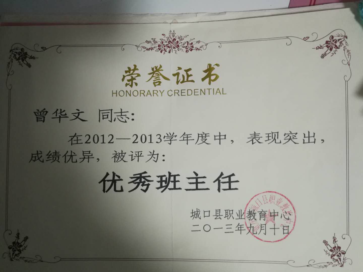1995年8月,城口县人事局、城口县教委评为“优秀教师”;2011年7月,中共城口县教育工委评为“优秀共产党员”;2011年12月,城口县旅游事业局“第二届中国大巴山(重庆·城口)彩叶文化旅游节先进个人”;2018年9月,天坤国际教育集团授予“天坤优秀干部奖”。