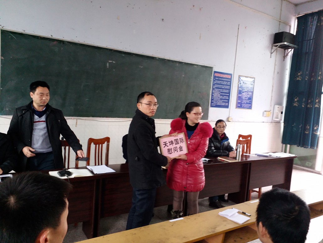近日,在全校最后一次教职工大会上,家中有患侵袭性多激素垂体瘤女儿的高场职中李达方老师收获了一份珍贵的爱心慰问—来自天坤国际集团为李老师女儿募捐的爱心捐款叁万元整。