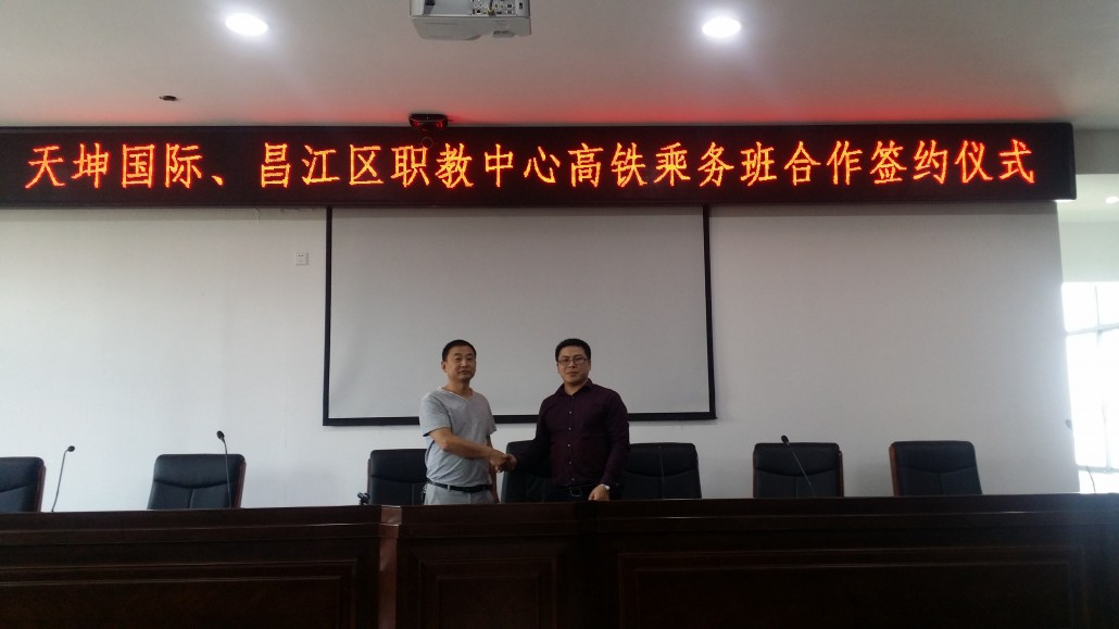 2017年5月24日,天坤国际教育集团与昌江区职业教育中心签署高级乘务班合作办学协议,签约仪式在昌江区职业教育中心举行。天坤国际教育集团就业培训中心主任张明星、昌江区教育局副局长张爱梅、昌江区职业教育中心校长张自强、昌江区职业教育中心副校长程佳胜等领导出席本次签约仪式。