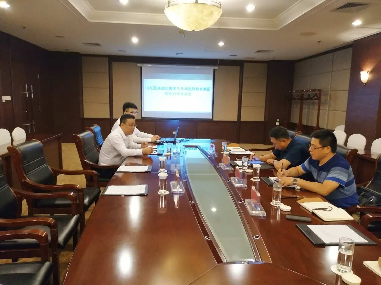 随后,双方举行座谈交流,在交流会上,山东蓝海酒店集团杨部长就企业的发展现状、产业结构及战略规划等情况作详细介绍;天坤国际教育集团总裁孙义就天坤国际控股集团及天坤国际教育集团整体情况进行介绍,并重点分享了天坤国际致力于打造人力资源全产业链及蓝领生态圈的未来战略规划及PPP合作办学模式。孙总表示天坤国际愿与蓝海酒店集团携手,共促蓝领产业发展。