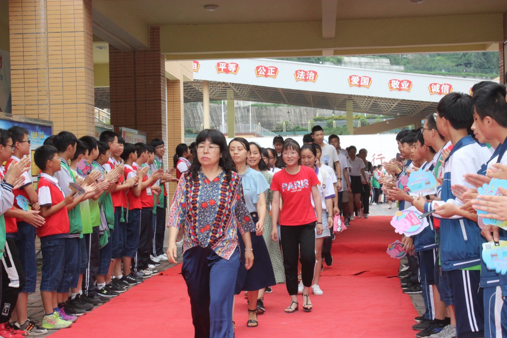 随后,全体初三学生在高校长的带领下,在修业班级学生的夹道欢送下,在《祝福》的歌声中,踏上红地毯,踏上新征程。