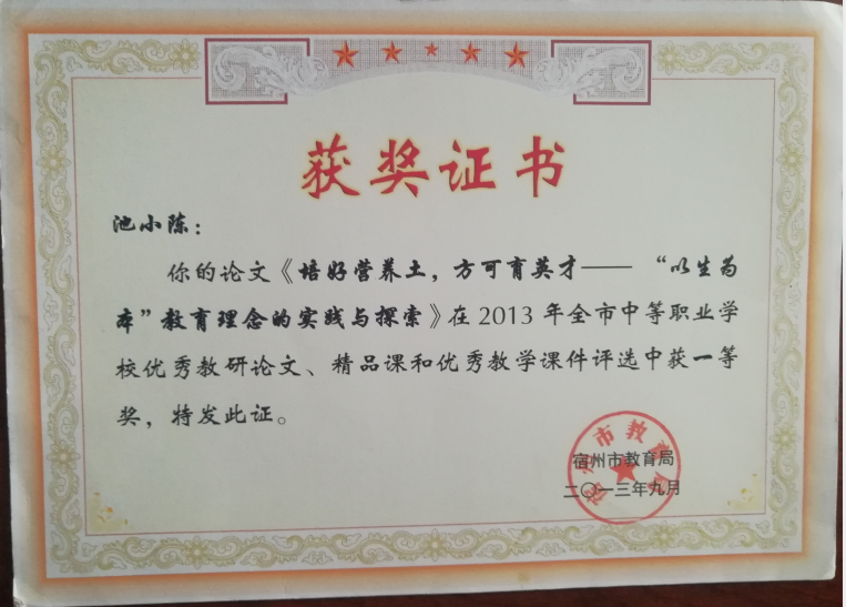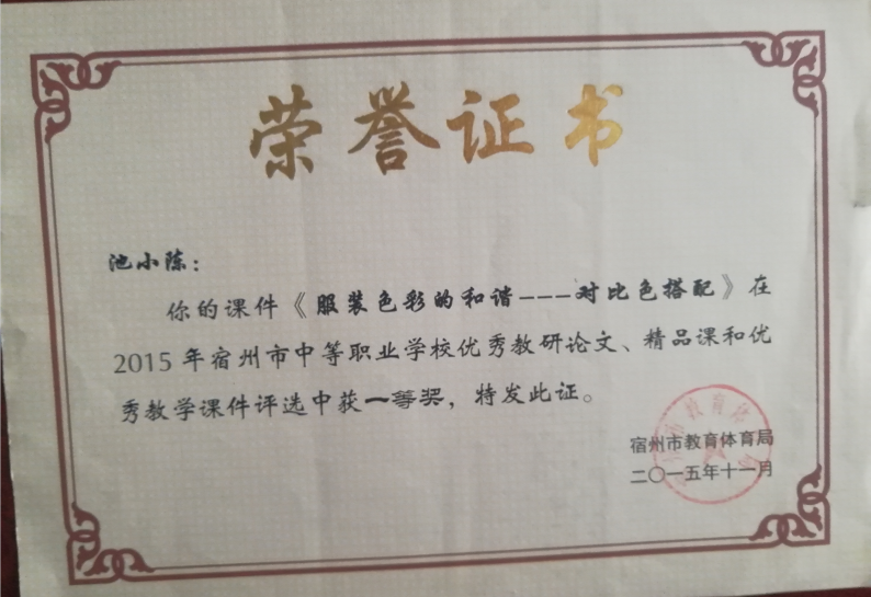2010年获得省优质课评选二等奖;2011年获得教学课件评选市级二等奖、省级三等奖;论文《深化课程改革研究》于2011年获得省级三等奖;2012年主编了《服装艺术与结构设计》校本教材;2012年荣获安徽省中职组信息化教学设计大赛三等奖; 2013年论文获得市级一等奖,省级三等奖;教学软件于2015年获得市级一等奖,省级二等奖; 2105年论文在国家级CN刊物——《阜阳周报》上发表;2016年获得县级“十佳班主任”荣誉称号;2019年获得集团“优秀班主任”荣誉称号;2019年获得集团举办的创新大赛一等奖;2020年辅导的学生荣获中职组平面模特技能大赛二等奖。
