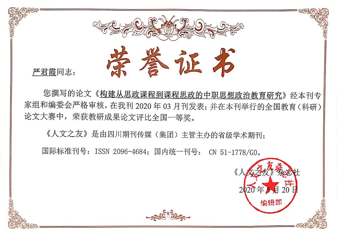 2020年3月在《人文之友》杂志上发表了《构建从思政课程到课程思政的中职思想政治教育研究》教育教学论文一篇。