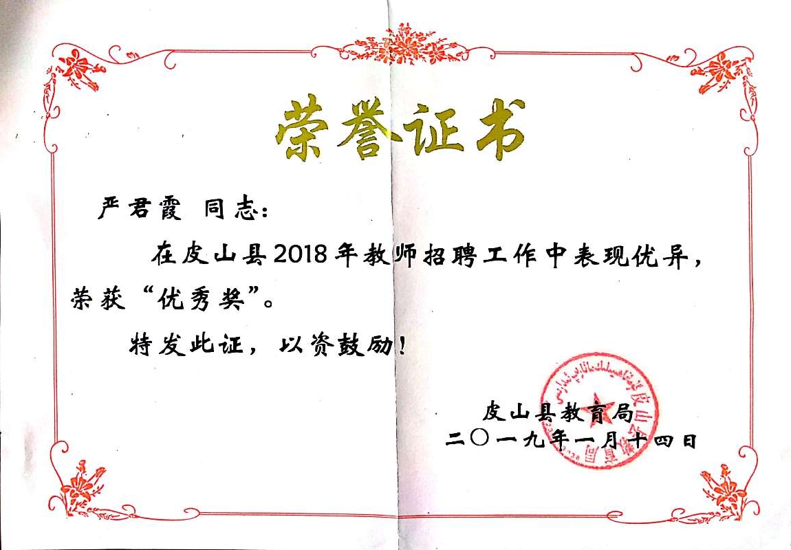 在最近几年的教师年度考核工作中先后被评为优秀教师。在皮山县2018年教师招聘工作中表现优异,荣获“优秀奖”。在皮山县2019年11月举办的思政课教师说课大赛中荣获“二等奖”。在2019年12月“和田地区第一届职业院校思政课教师说课暨案例分享比赛”中荣获“优秀奖”。