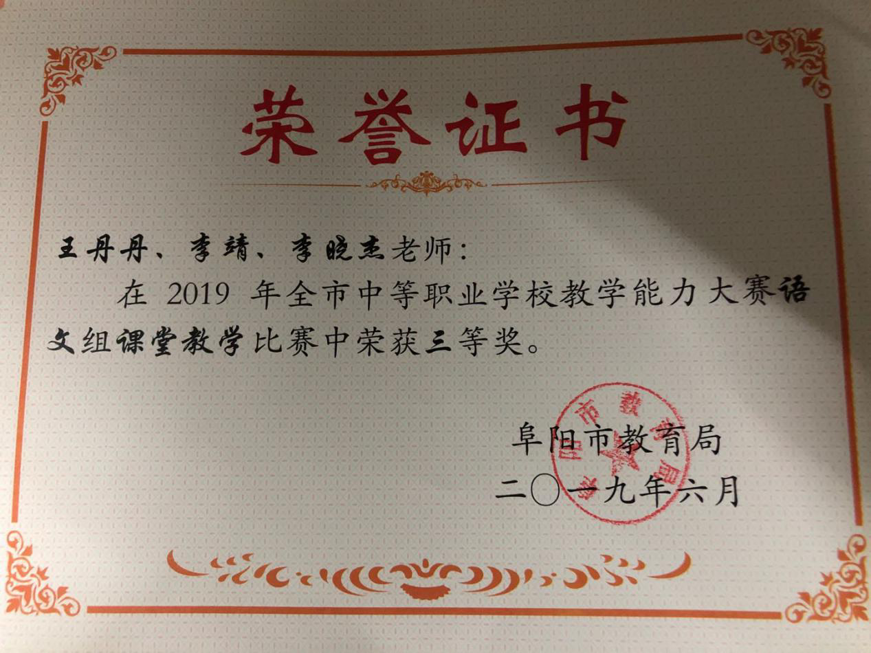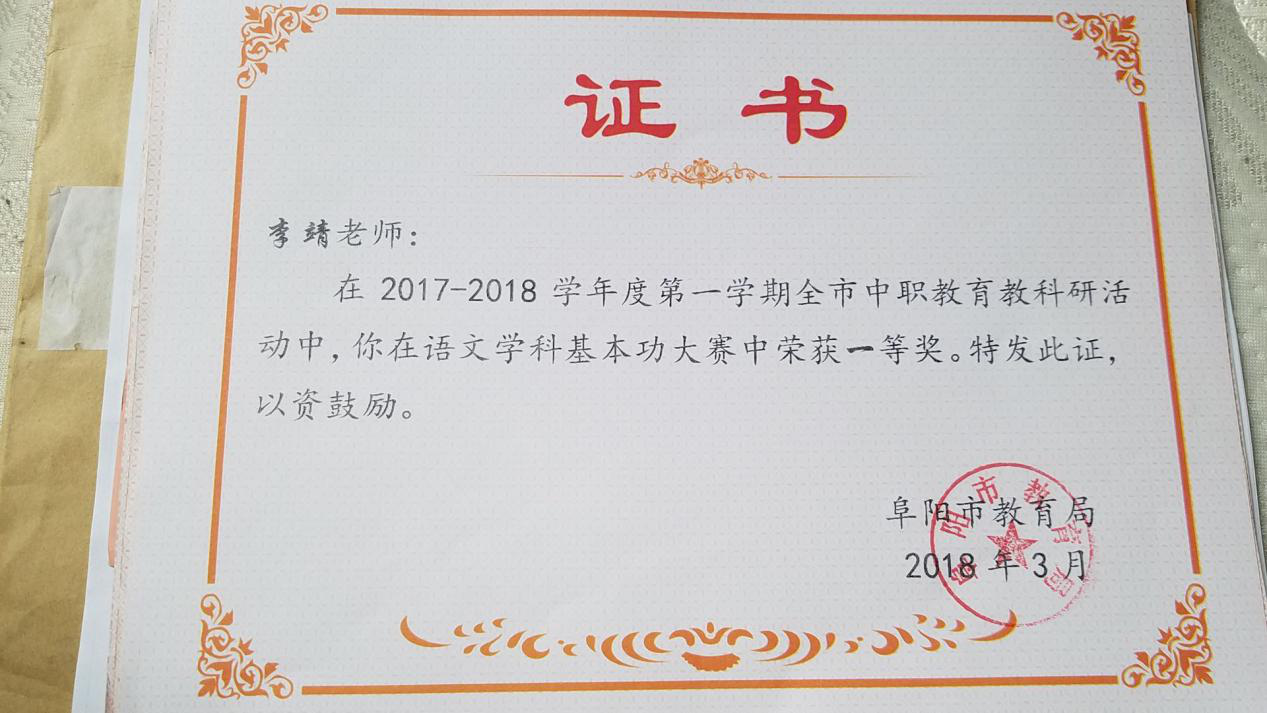 李老师具有很强的教学能力。职业学校的学生基础、学习习惯都较差,如何提高学生的学习兴趣,提高课堂效益,是每一个职业学校教师时刻研究的课题。精心上好每一堂课,了解最新的教学方法,注入到自己的教学中去,使教学更具有鲜活感,更具有时代气息。在2018年阜阳市语文教师基本功教学大赛中荣获一等奖。2019年阜阳市中等职业学校教学能力大赛中获得三等奖。