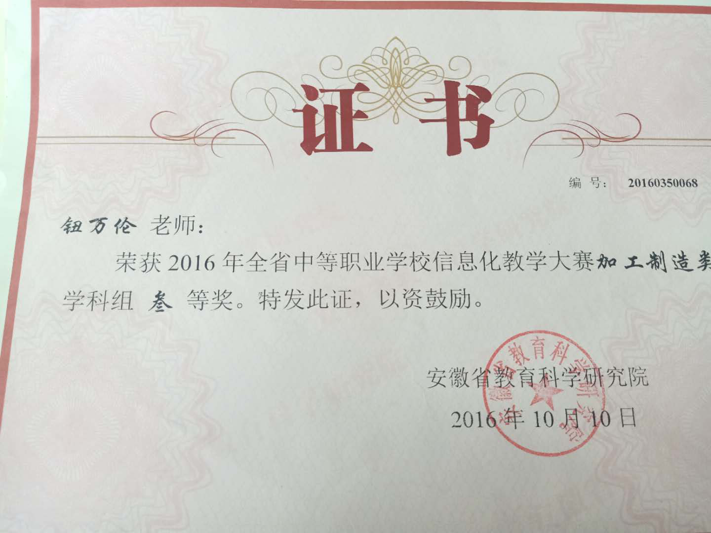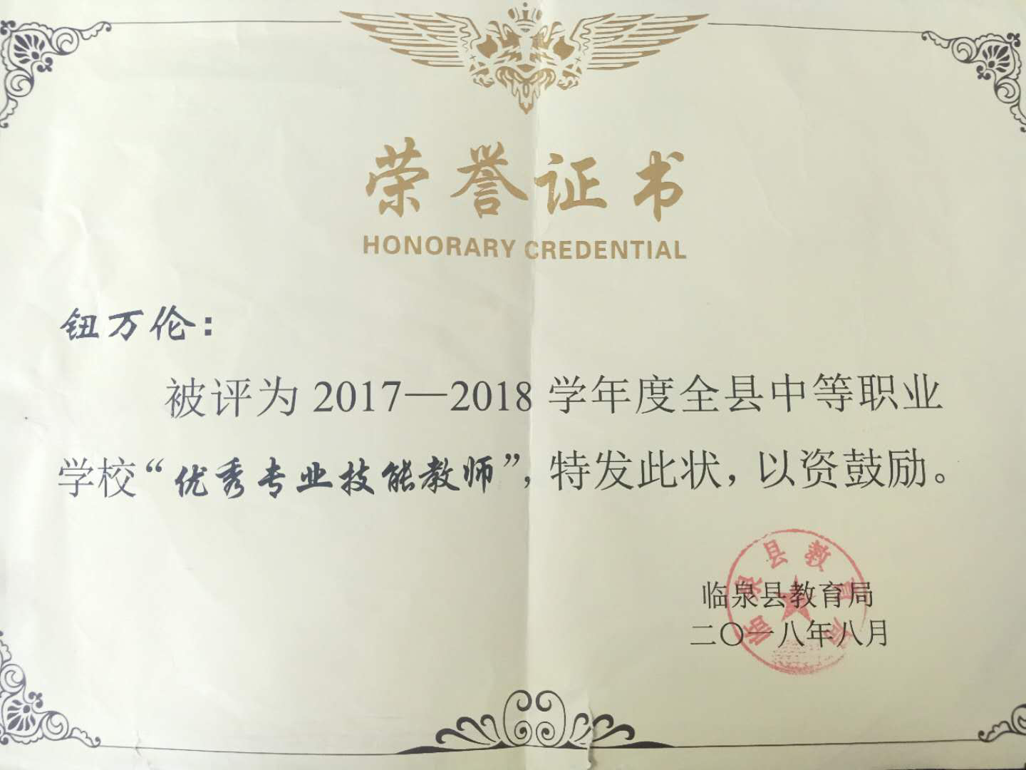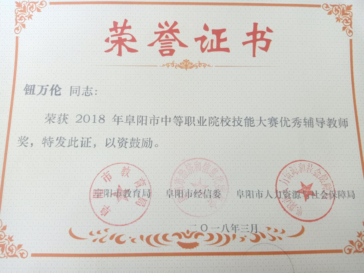 在学校五年间,积极参与各项比赛,在教学能力大赛中,先后2次获得省级三等奖、1次市级1等奖,2次市级二等奖,校级优秀共产党员等荣誉。辅导学生参加技能大赛,多名学生获市级奖项。2018年获临泉县优秀技能教师、阜阳市中职院校技能大赛优秀辅导教师奖等荣誉称号,2019所带班级18汽车1班获临泉县优秀五星红旗团支部。