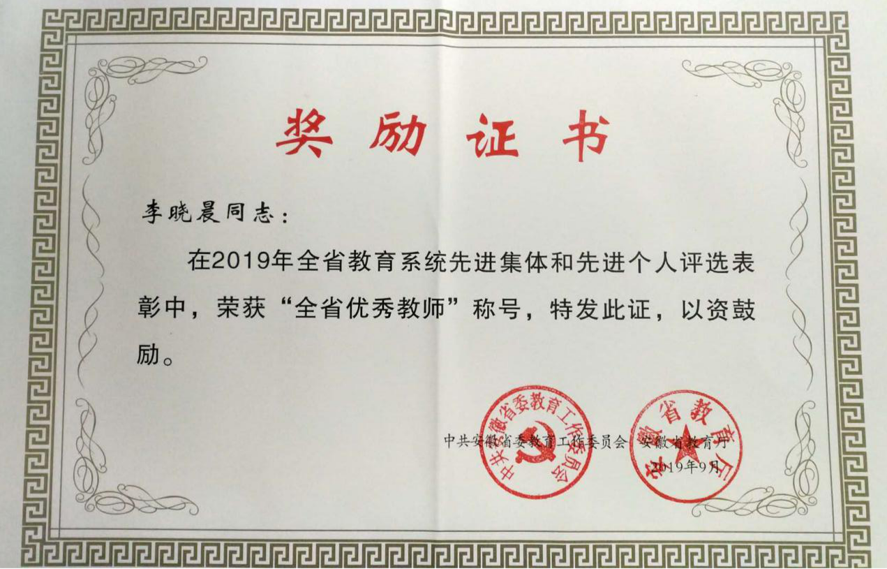 曾获得安徽省“优秀教师”、阜阳市“优秀班主任”、阜阳市“优秀专业技能教师”、阜阳市“师德标兵”、临泉县“骨干教师”、临泉县“优秀专业技能教师”连续3年评为”天坤专业教学大师”。