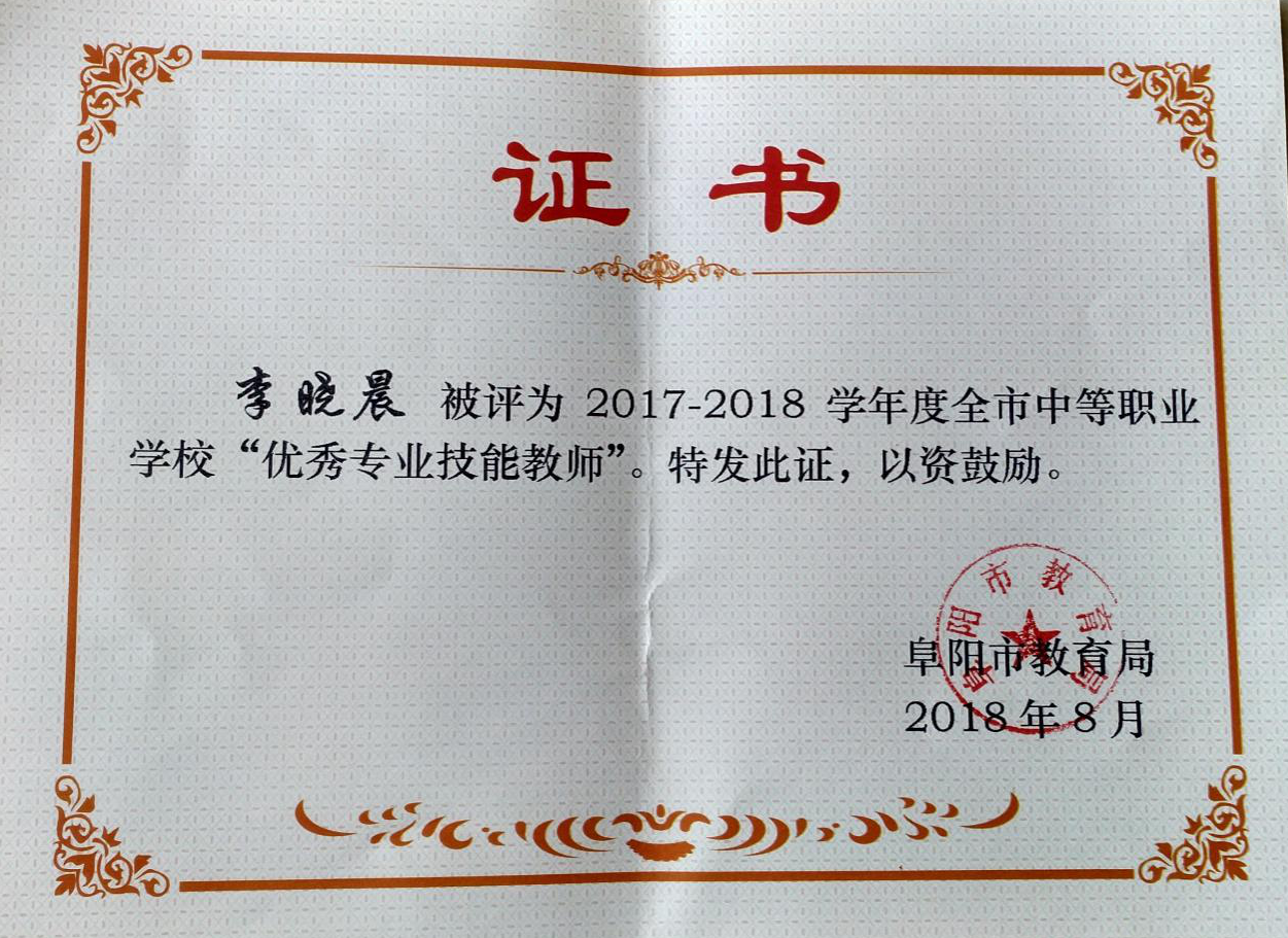 李晓晨,女,1971年7月生,安徽省临泉县人,1992年参加工作,本科学历,中学高级教师。安徽省中等职业教育质量提升工程项目——名师工作坊领衔人。