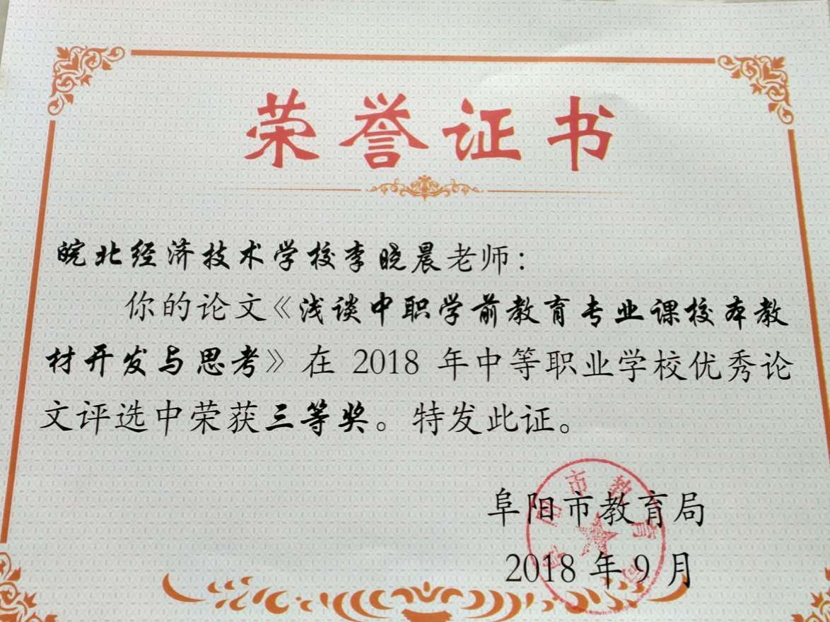 李老师把自己多年的教学经验和现代的职业理念相结合,分别于2016年编写了校本教材《幼儿教师教育案例分析》。2018年编写了校本教材《学前教育专业讲故事训练》,已投入课堂使用。解决了本校学前教育专业没有适用教材的难题。她积极撰写论文、制作课件其中《浅谈中职学前教育专业课校本教材开发与思考》获阜阳市中职论文三等奖;《浅析中职学前教育专业校本教材建设》获省级论文一等奖;《讲故事训练》获中职课件二等奖;《浅析中职班主任进行德育教育的几点体会》获阜阳市中职论文二等奖;《幼师班主任如何加强对班级管理》获阜阳市中职论文三等奖。