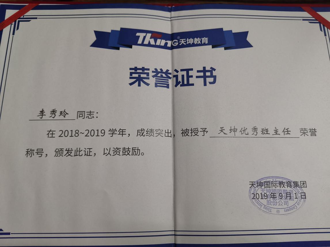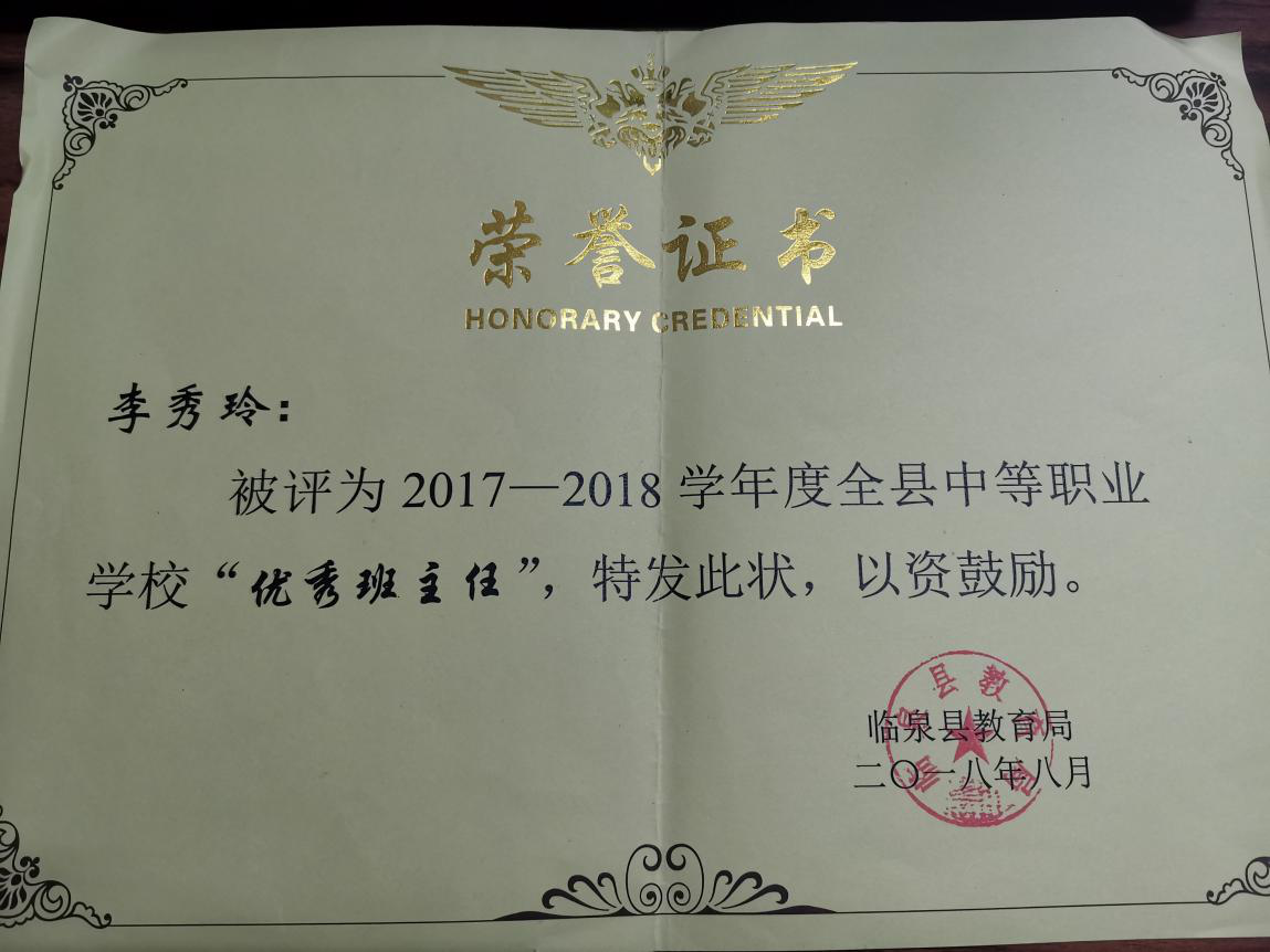 培养优秀班干部,创建优秀班集体。她所带的17机电3班一直是追求团结进取的班集体,始终坚持“机电3班,青春无限,超越梦想,勇于争先”的班级精神,深受学校领导的好评。在班级全体同学的共同努力下,多次获得“文明班级”“文明宿舍”称号。技能大赛市赛、省赛,临泉县“能工巧匠”大比武中,王杨瑞、李梦辉、陈婷婷、李坤、吕运来等多位同学多次获奖。其中王杨瑞同学获得 2018-2019学年度“临泉县最美中学生”荣誉称号。还被天坤教育集团授予“天坤优秀班主任”称号,以兹奖励。
