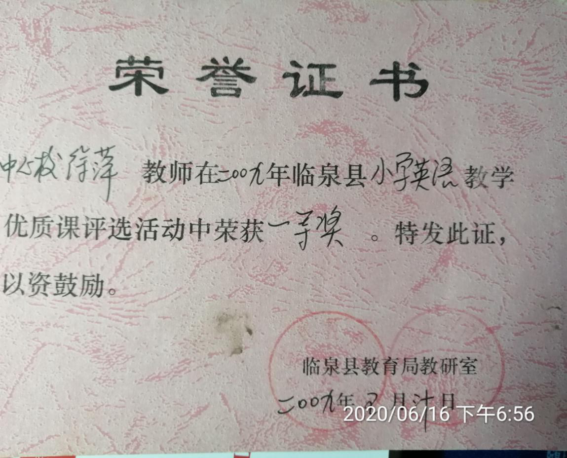 她所获得的奖项:2009年5月优质课一等奖。2011年至2012年在教学改革工作中被评为新课程改革的先进教师。2015年撰写的论文荣获省级三等奖。2018年3月荣获阜阳市中等职业院校技能大赛优秀辅导教师奖。2018年4月在《当代教育实践与教学研究》发表论文1篇。2017-2018学年度被评为“先进个人”。2020年在《中国教师》第二期发表论文1篇。
