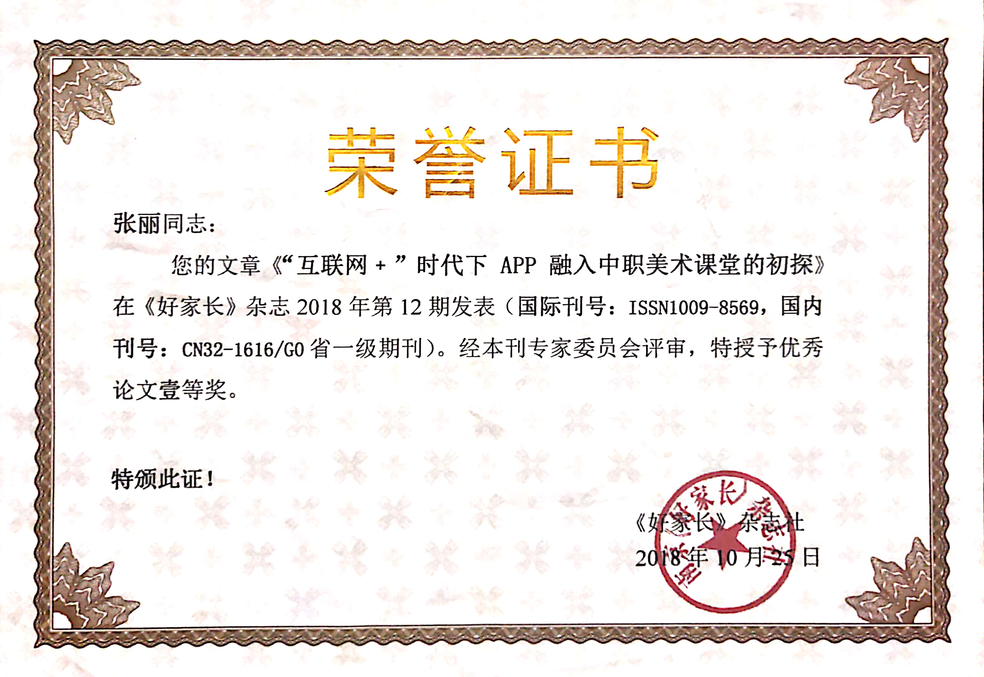 她获得的论文获奖:2012年8月撰写的论文《如何利用美术课堂释放中学生的心理压力》获阜阳市教师论文评选三等奖;2014年8月撰写的论文《浅谈新课程标准下美术教学中的兴趣和情感》获阜阳市教师论文评选三等奖;2014年8月撰写的论文《关于新课程标准下美术教学中情感表达的一点思索》获临泉县教师论文评选三等奖;2017年9月撰写的论文《APP融入中职美术课堂的初探》获得临泉县教师论文一等奖;2018年10月撰写的论文《“互联网+”时代下APP融入中职美术课堂的初探》在省级刊物《好家长》第12期发表,并授予优秀论文一等奖;2019年7月撰写的论文《当下APP融入中职美术课程的初探》在2019年全市中等职业学校优秀论文评选中获得二等奖;2019年11月撰写的论文《浅谈如何借助“APP”改变中职美术课堂的教学方式》在国家级刊物《天天爱科学》杂志2019年11发表,并授予优秀论文一等奖等等。