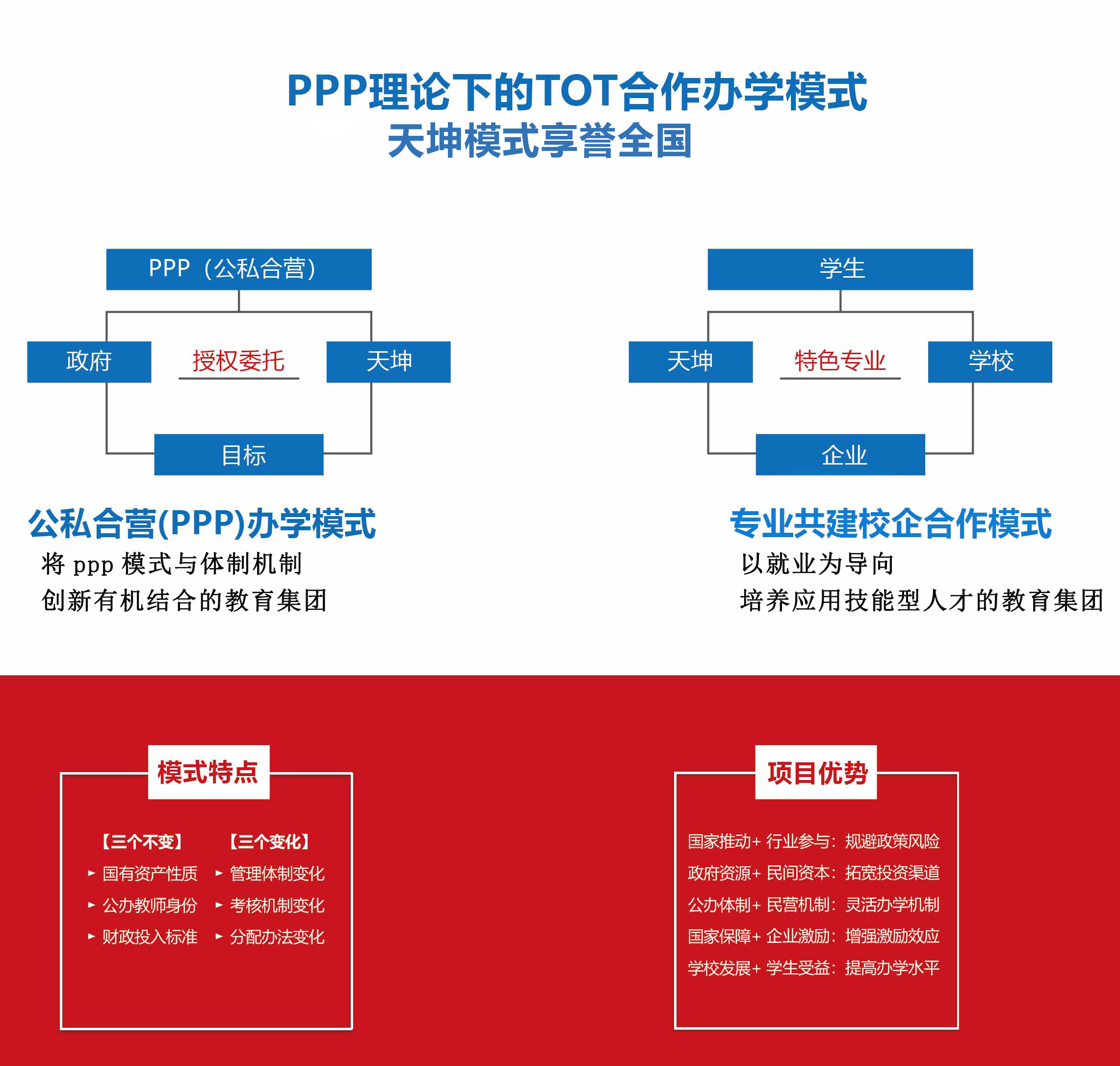 PPP即Public—Private Partnership的简写,直译为“公私合作”。天坤国际教育集团突破政府和行业组织对PPP融资概念的理解,将PPP的根本属性(公私合作)运用到与政府合作办学及学校管理机制创新之中,提出基于PPP理论下的TOT合作办学模式。
