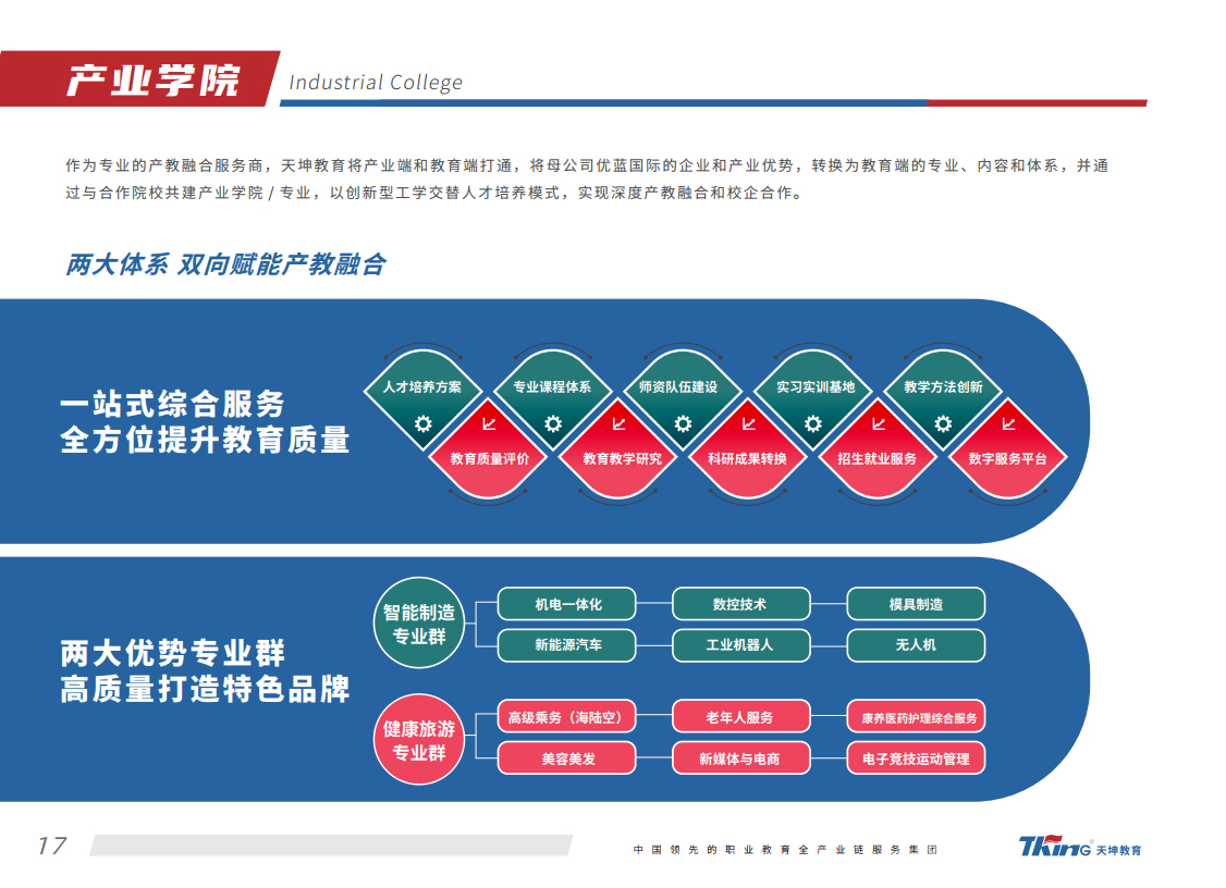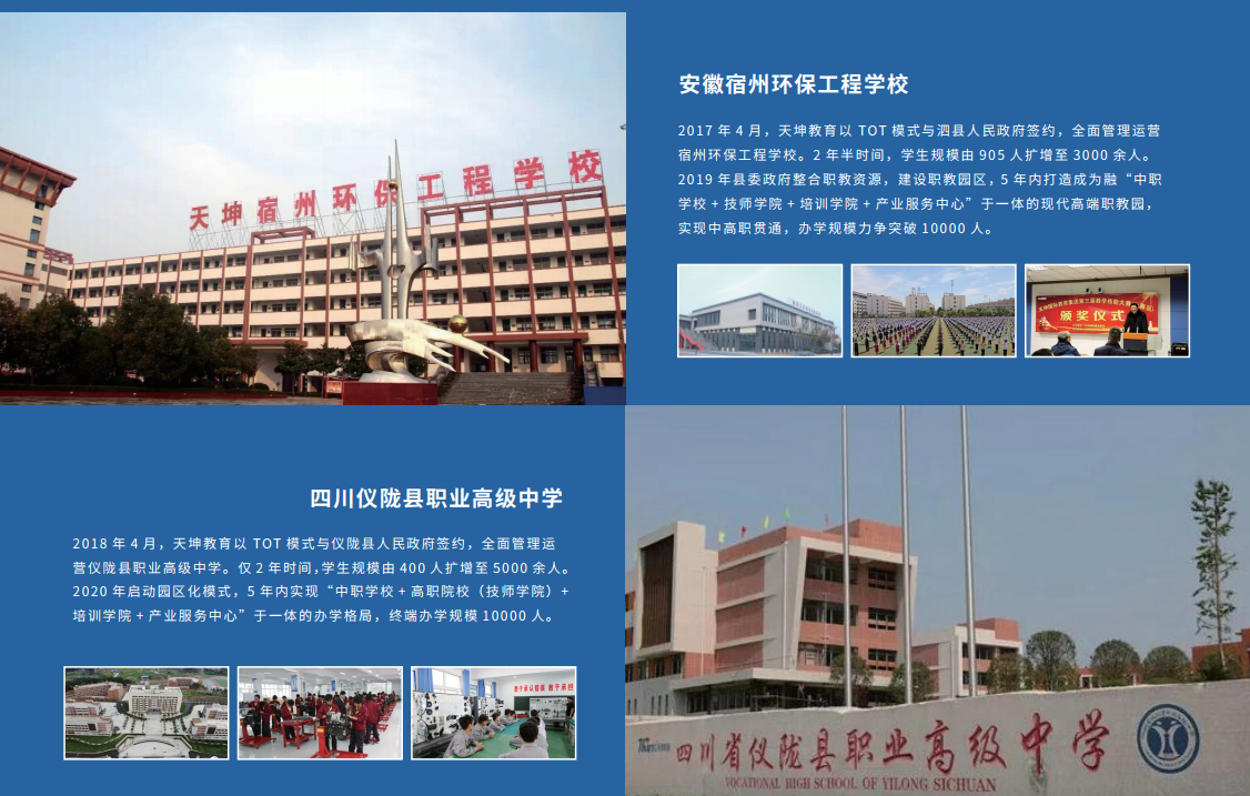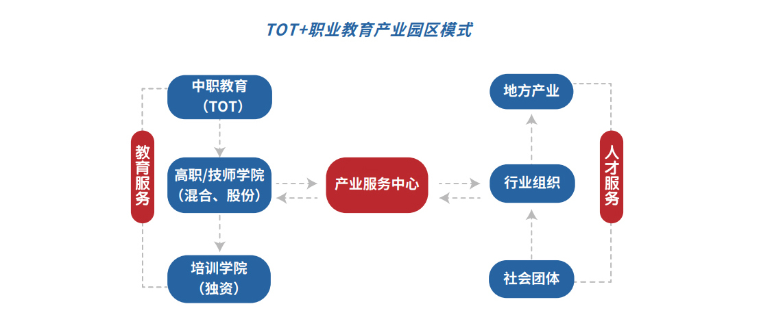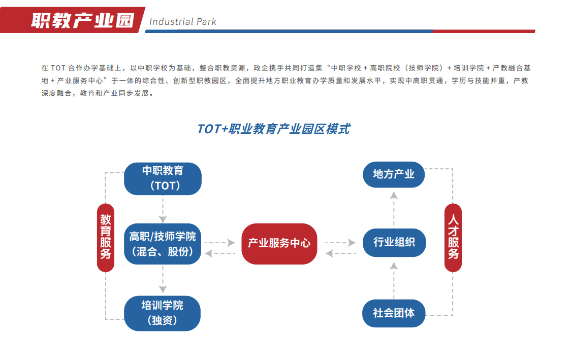 在TOT合作办学基础上,以中职学校为基础,整合职教资源,政企携手共同打造集“中职学校+高职院校(技师学院)+培训学院+产教融合基地+产业服务中心”于一体的综合性、创新型职教园区,全面提升地方职业教育办学质量和发展水平,实现中高职贯通,学历与技能并重,产教深度融合,教育和产业同步发展。